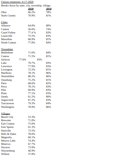 Below is further explanations and 2020 response data for Stark County as of June 17th, 2020. From that memo: “Each uncounted person in Stark County is a potential loss of $2,900 – money that could be used to assist our struggling economy and public services.”